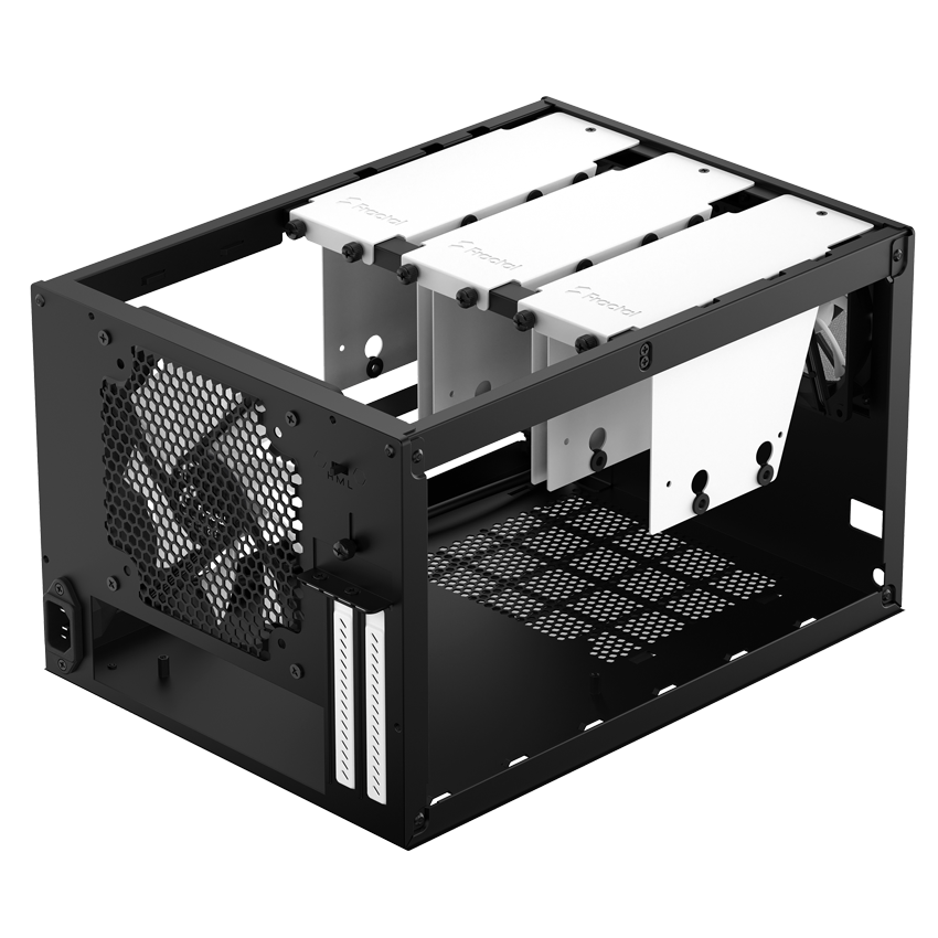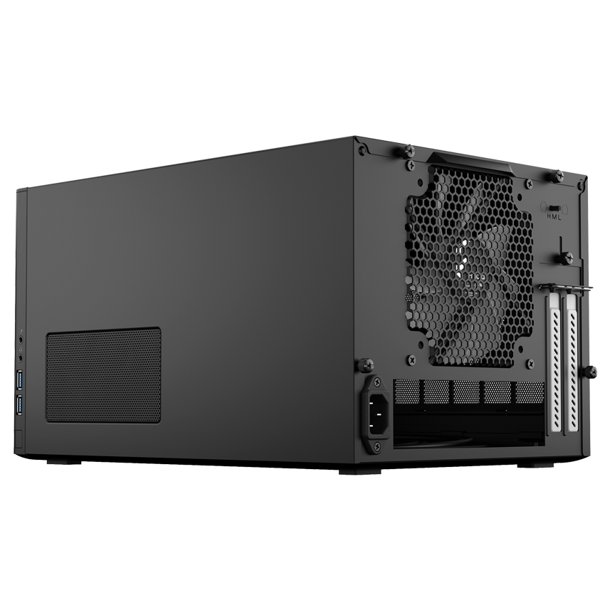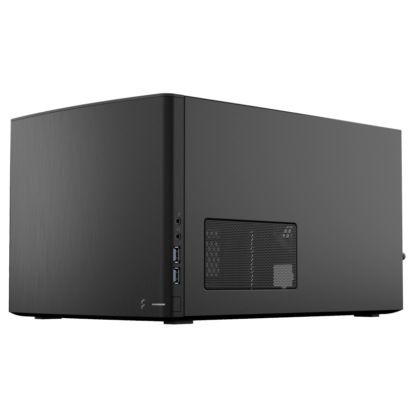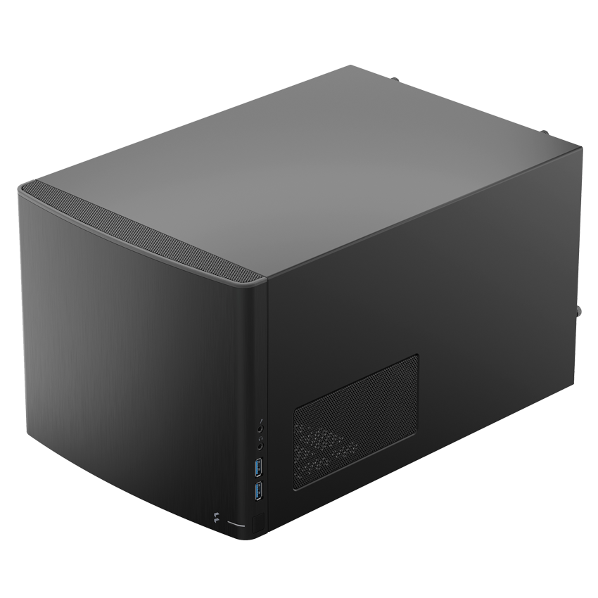 Boîtier format mini-cube très silencieux : 1 ventilateur 85 mm en face arrière + 1 ventilateur 120 mm en face avant.1 baie 5.25" (face avant), 2 baies d'extension (face arrière).