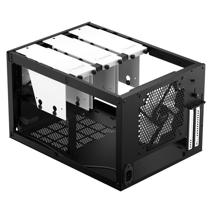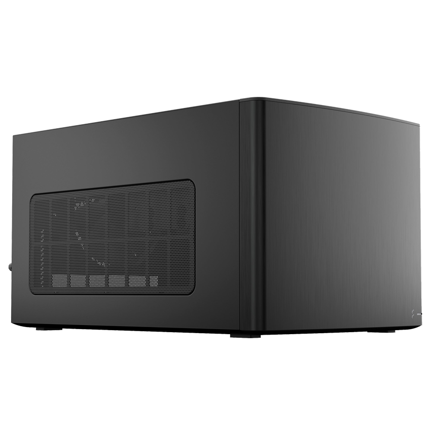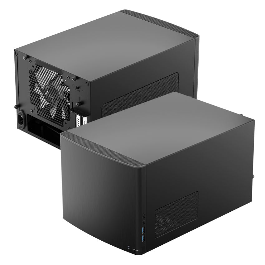 Boîtier format mini-cube très silencieux : 1 ventilateur 85 mm en face arrière + 1 ventilateur 120 mm en face avant.1 baie 5.25" (face avant), 2 baies d'extension (face arrière).